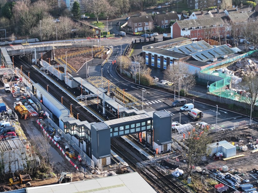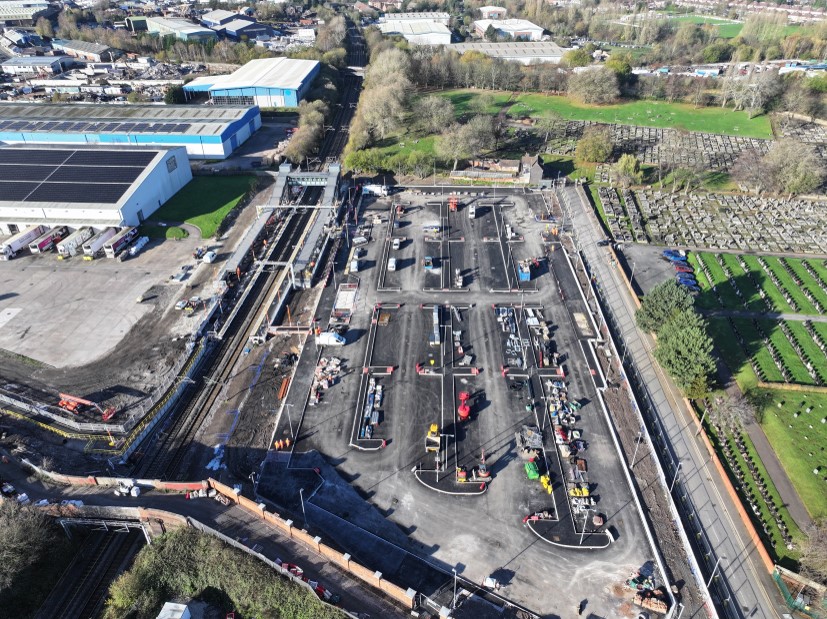 At Darlaston, the cladding to the lift shafts has been applied providing a clearer view of the sky. And the base layer has been applied to the station car park that will accommodate 300 cars for commuters including EV charging points.